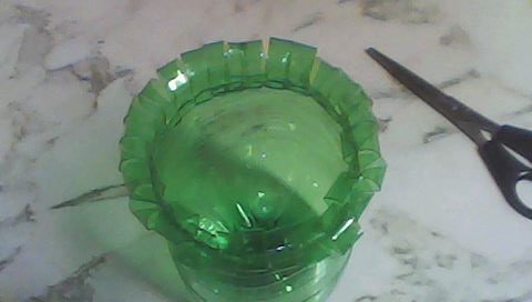 2ºPasso: deitamos a parte com  gargal ao ecoponto de plastico e usamos a parte de baixo da garrafa. Recortar tiras com quase um centimetro cada.